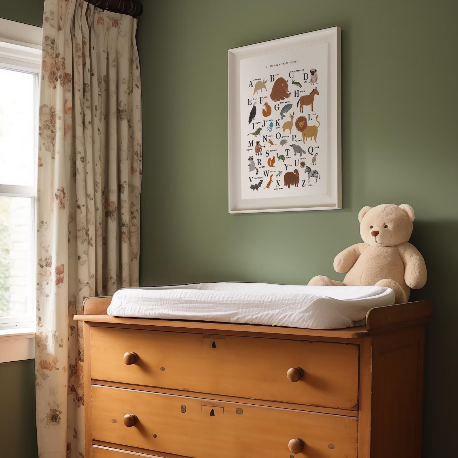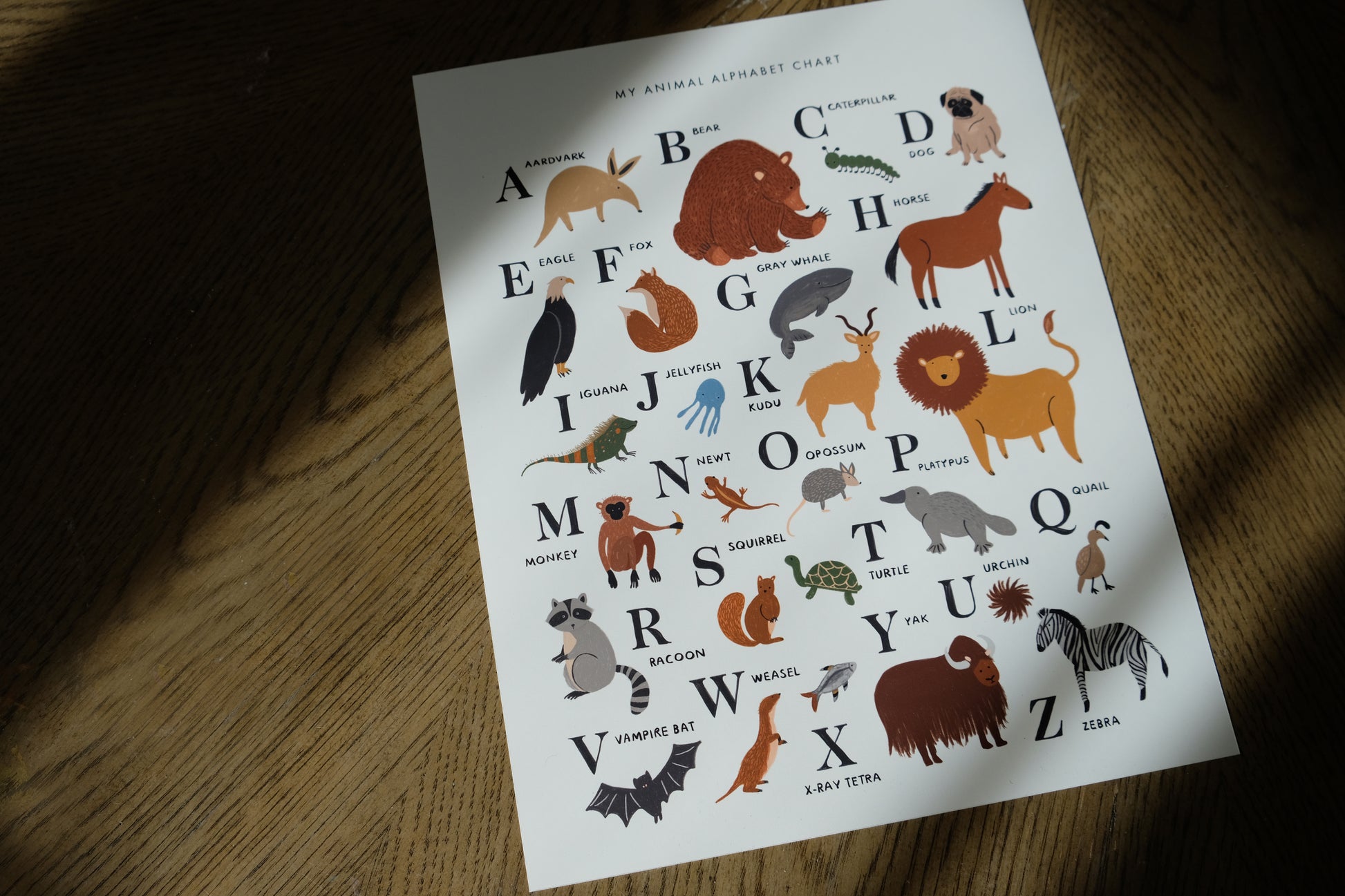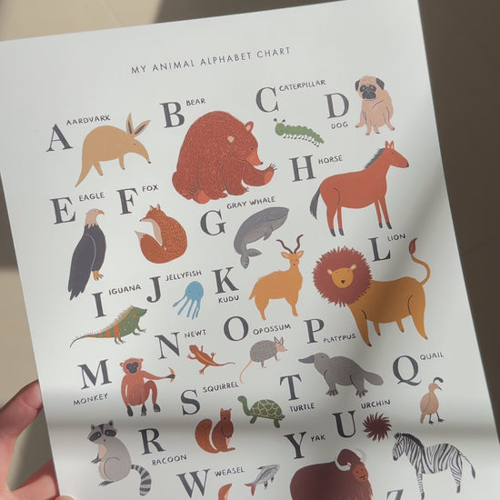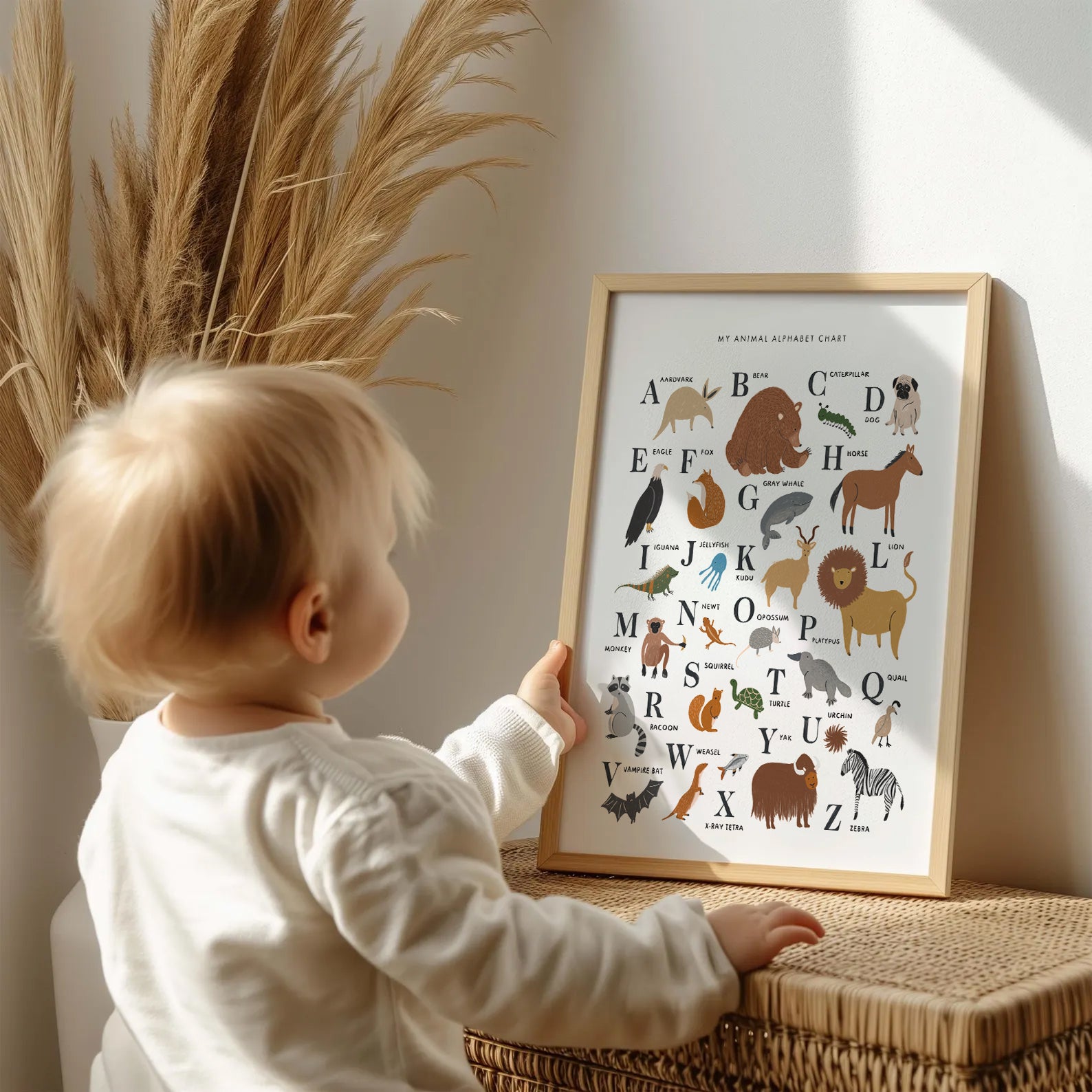 Introduce your child to the alphabet with this tasteful and vibrant animal-themed poster. Ideal for enhancing a nursery, bedroom, or playroom, this educational print combines colorful illustrations and clear letters to encourage learning in an elegant and inviting way.